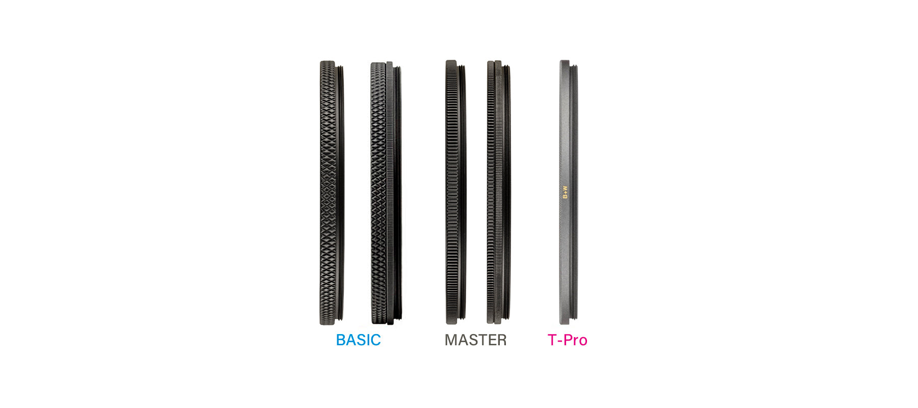 B+Wのフィルターには3つのグレード「BASIC、MASTER、T-Pro」が設定されています。風景やポートレート撮影などにおいてフィルターを初めて使う方にも最適な、コストパフォーマンスに優れたラインナップを誇る「BASIC」シリーズ。防汚性のある16層マルチレジスタントコーティング(MRC多層耐性コーティング)を採用し、反射を最小限に抑えた「MASTER」シリーズ。MASTERシリーズ同様に多層耐性コーティングを採用し、細枠のフィルターリングやチタンカラー仕上げを施したプレミアムな「T-Pro」を展開しています。※革新的な薄層技術による多層耐性コーティングの製品化は世界初。